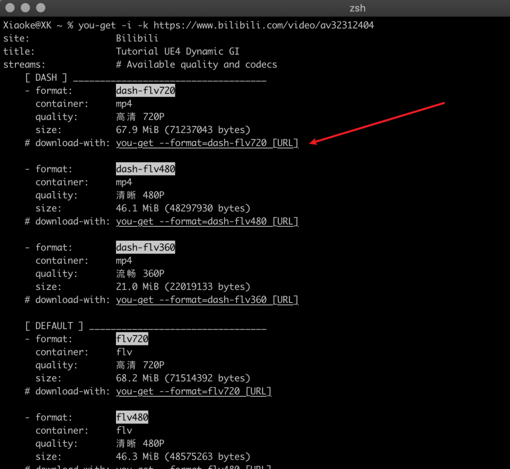如果要查看可用画质和格式,可以加-i参数,然后根据需要按对应的”# download-with”命令下载即可: