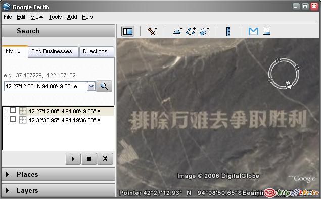 最近网上传的很火的几个Google Earth Beta4 坐标!地面上的标语显示的非常清晰。