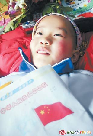 新闻提示:05年10月,7岁的小欣月摔倒在了学校的操场上,髓母细胞瘤给这个天真的孩子判处了“死刑”。3个月前,小欣月失明了。她最大的梦想就是能站在北京天安门前看升旗仪式,听国歌响起……好心市民愿意帮助欣月圆她的北京梦,但她身体状况不好,医生建议不要去。为了不让欣月失望,父亲编造出善意的谎言,决定在长春找一个有国歌响起的地方,到时就告诉她,那里就是北京天安门。