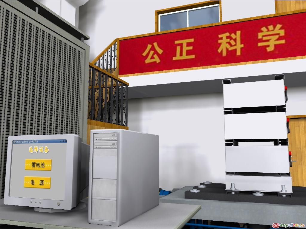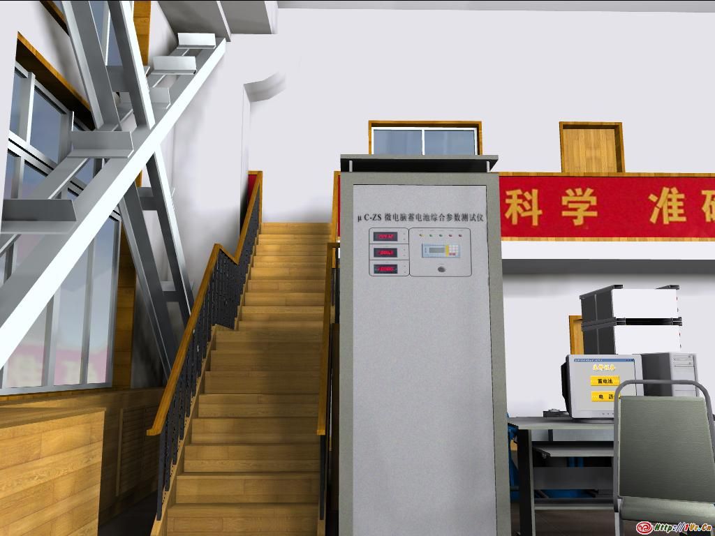 Vrml虚拟部分:依旧利用Vrml多重纹理扩展节点为重点技术,使用简单的渲染烘托实验室庄重严谨的气氛.利用Vrml脚本技术构造了可进行与蓄电池测试设备交互试验操作的功能,可即时更换试验设备,生动形象环保的演示了进行试验的过程.