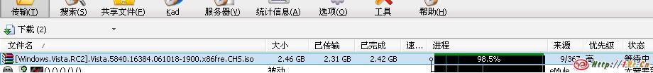 前些天以为Vista出5744这个版后就不会再泄漏出来什么特别的版本,直接就是正式发布了,没想到昨天又出现5840版本,是在电驴上的,有中文和英文两个版本,据说中文是官方的版本,非个人汉化版本,前些天下了一个5744双语版,结果可能ISO有问题,安装失败,昨天开始用电驴拉的5840,开始的速度很不错,过100K,而现在到了98.5%就完了,好像没什么源了,VistaFans上也是N多人卡在这里了,估计下班之前拿不回家测试这个版本了.555~~