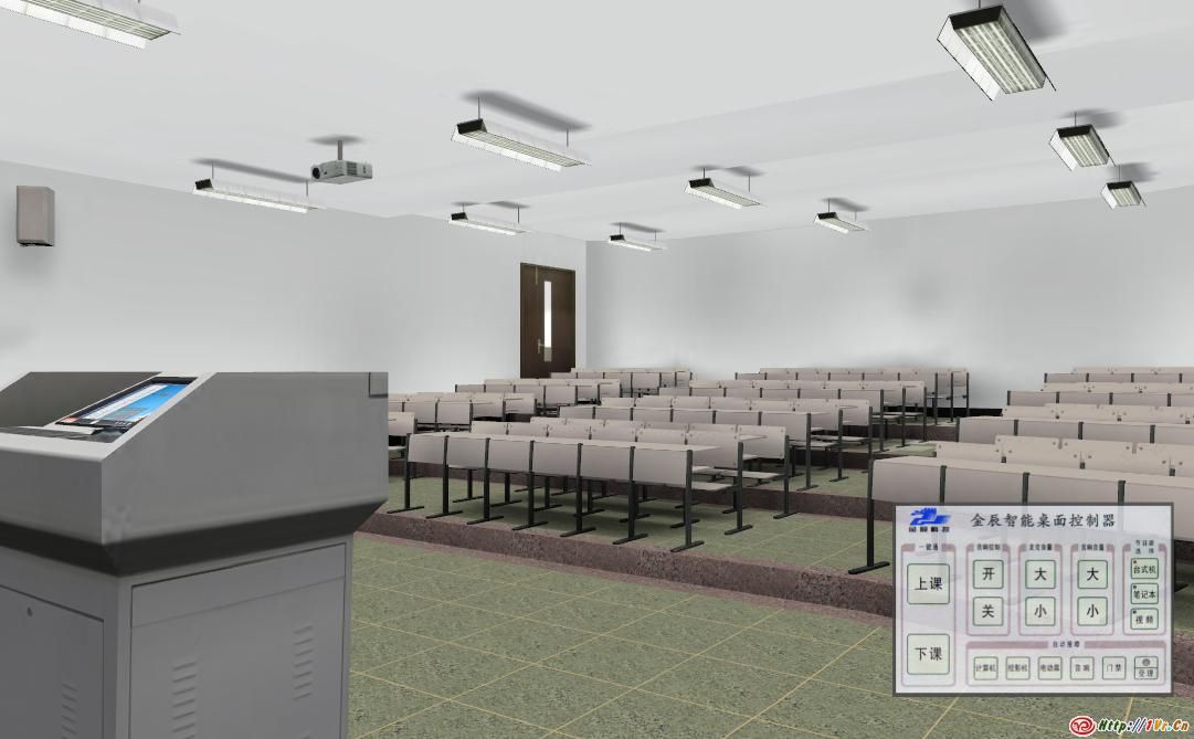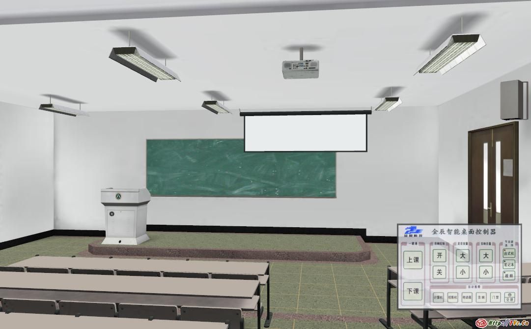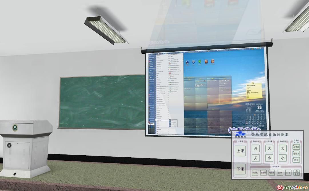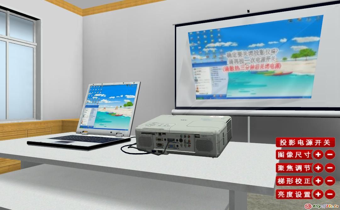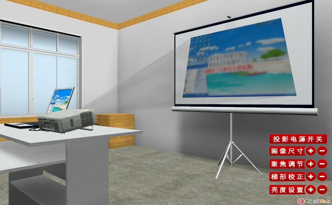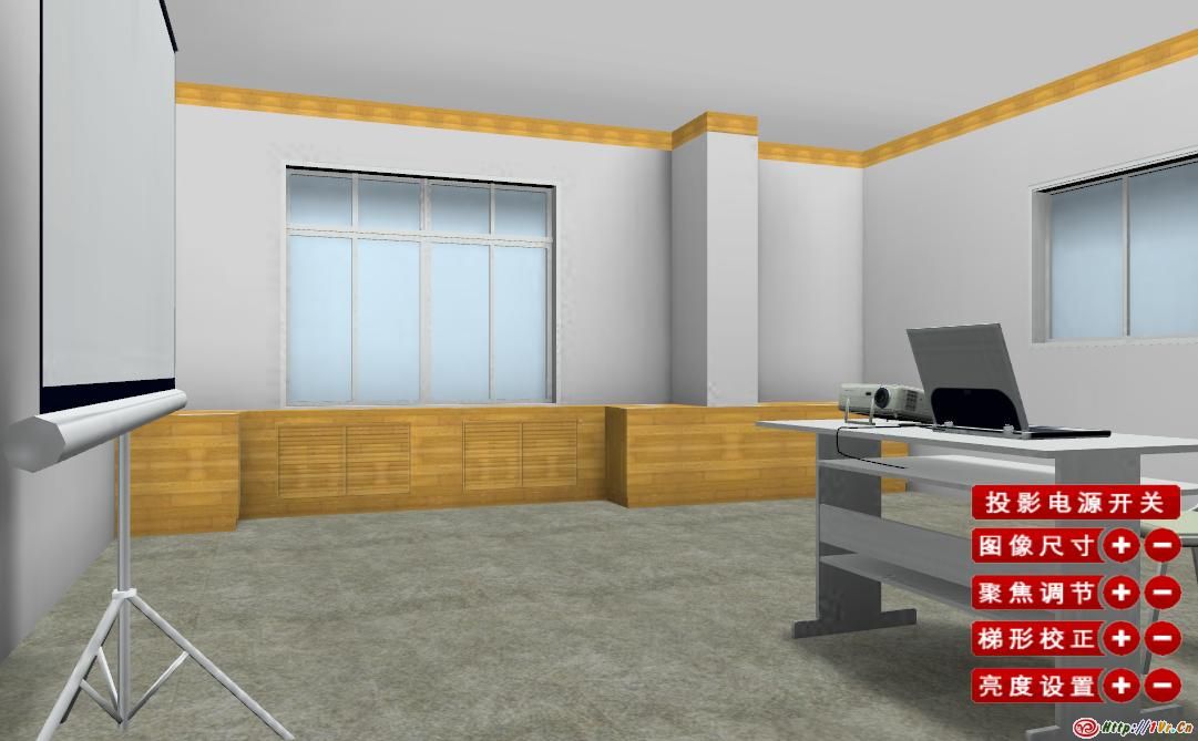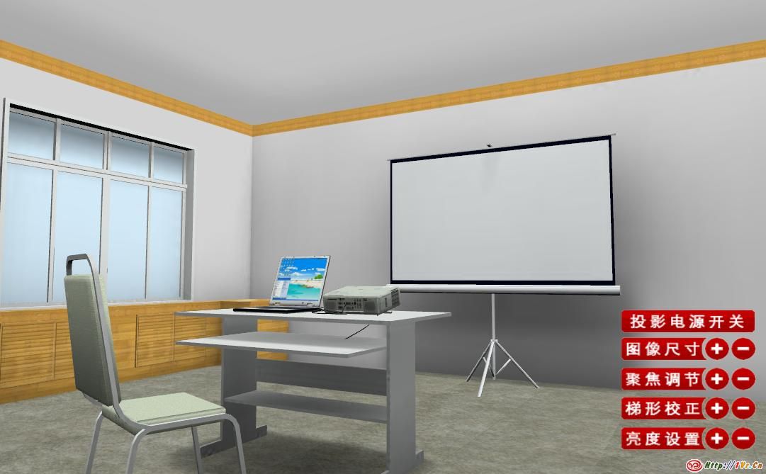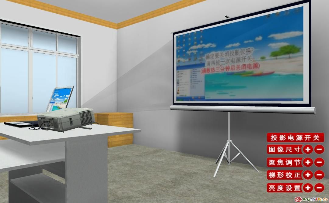 此演示实现了投影机的虚拟模拟,当靠近投影仪的时候,屏幕右下角弹出控制菜单,可以进行投影仪的开关,亮度调整,梯形调整,聚焦调整,图像大小调整等等模拟.本例以NEC VT770投影仪为原型进行虚拟仿真.投影仪后方的插口均有提示说明,方便学习使用投影仪.