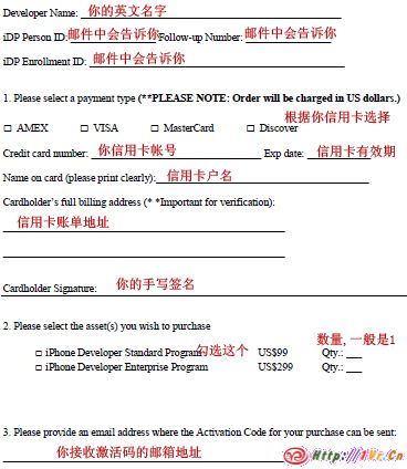 给chinadev@asia.apple.com发封邮件.说明你有意申请IDP,可以用中文.apple那边有专门的中文客服负责回复你的.他们会给你回复一封邮件,并带有一个PDF文档.按照下图填写表格,除了你的手写签名外,其他都只能用英文填写.