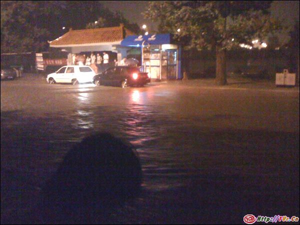 准备坐车回家时已经晚上十点多了,公交车慢悠悠的开着,突然开始下雨,雨大的完全出乎我的想象.下车,急忙的钻到车站雨搭下,看表11点了.雨点砸脑袋,路面上积水也非常多,足足超过10厘米.媳妇肯定睡了,就想着怎么办呢.