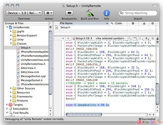 打开Unity Remote项目文件.找到Setup.h,将默认的一些帧率,画质等进行降低设置.Remote端的图像是Jpg,默认压缩率是50,将它降低些,比如25,修改JpegQuality处.如果你不需要重力感应调试可以将它的帧率调整为0,也可以降低整体图像的帧率.我进行这样的设置 FPS = 40, AccelerometerFPS = 15.