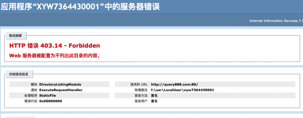 直接访问query888.com域名, 报服务器页面错误,看提示是windows服务器的iis环境.此刻已经基本确定这桶水是有问题的了.