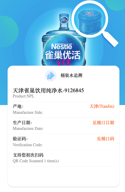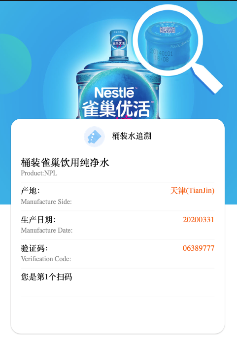 前几天因为某些原因换了雀巢品牌的桶装水,撕下的瓶口防伪标签没扔,昨天想起来查查真伪,微信扫码后出现了”正品”页面.
