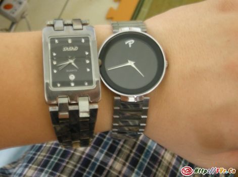 俺穷,买不起劳力士啥的,只能弄点国产的名表戴了,左边这个是戴了快2年的帅仕达表,听说是算国产名表,从王府井买的,不过可惜不知道怎么搞的表蒙裂成了两半,本来想凑活戴着的,可表链又开始下锈了,今天就又花了几十大元凑活买了一只新的,没有秒针,刚开始用还真不习惯呢,总要愣一下,确认表是不是还在行走着.很轻,外型还算可以吧,是不?