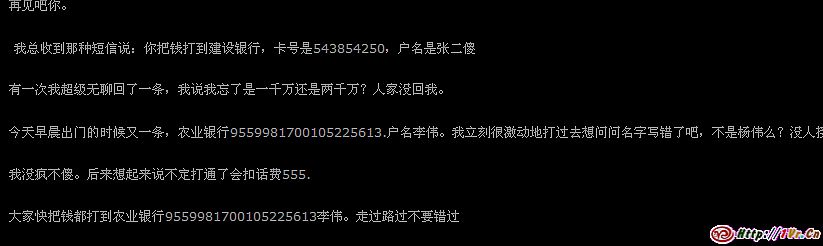 换手机了,没合适的防火墙.就先放着了,垃圾短信真不少.昨天又来一条骗钱的让我转账的短信,这家伙脑袋灌大粪了吧.这样也能骗到钱?不过没准,估计会有比这家伙智商还低的.短信的来电号码13643209115,让我把钱打到农业银行9559981700105225613里,名字是李伟.
