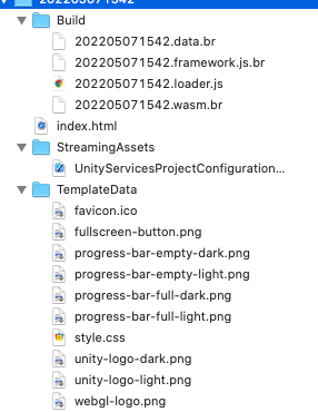 Unity越来越好了,新建项目切换到WebGL目标平台后使用缺省设置编译出的文件就可以用于服务器部署了(https://docs.unity.cn/cn/current/Manual/webgl-building.html).这次我使用了Unity 2021.3.2f1 macOS版,编译后会有如下结构的文件: